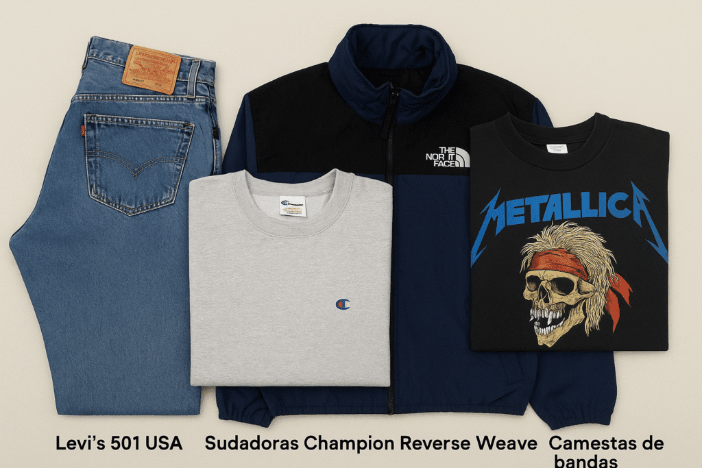 - Implica una curaduría de prendas especiales (Levi’s 501 USA, sudaderas Champion Reverse Weave, chaquetas The North Face 90s, camisetas de bandas originales, etc.).